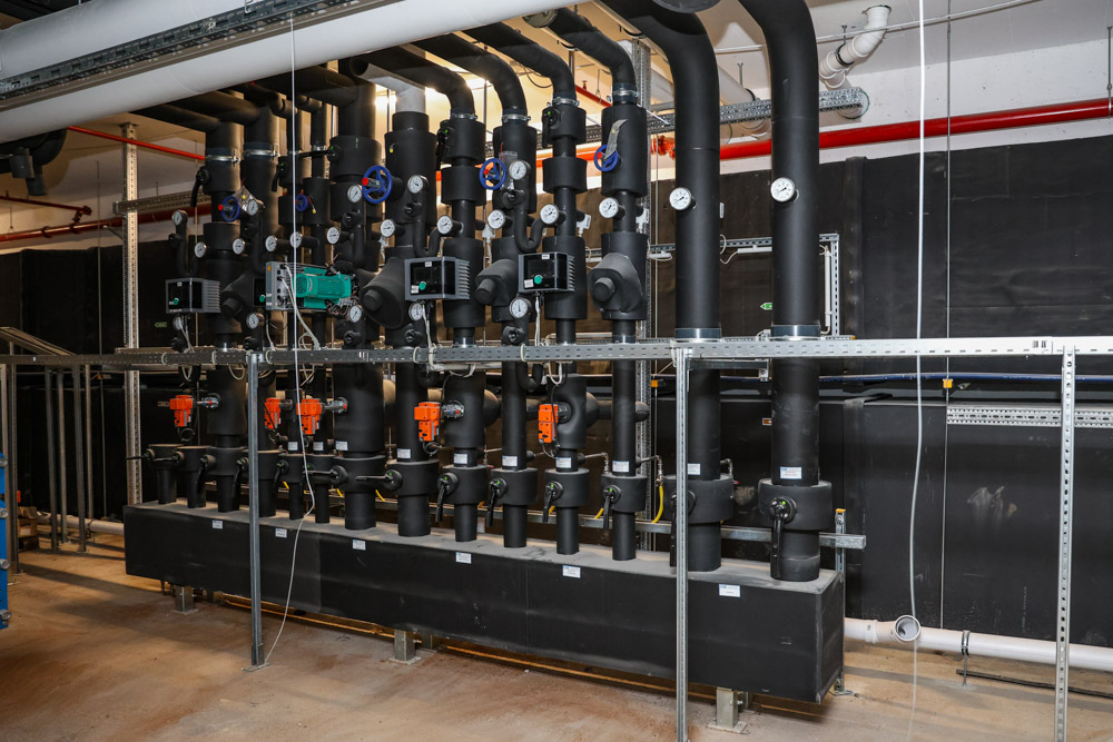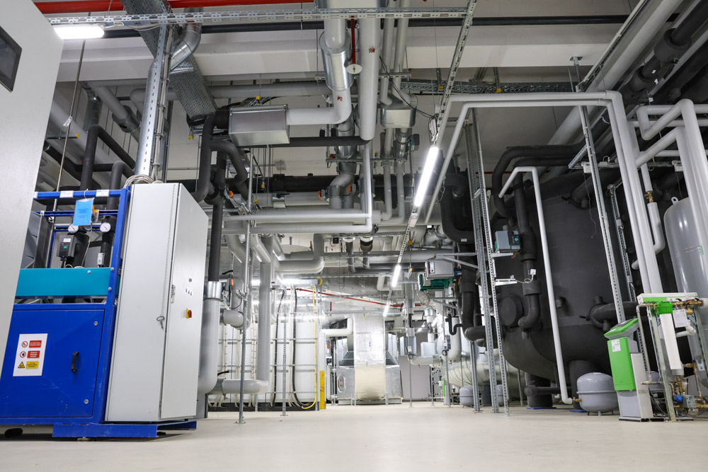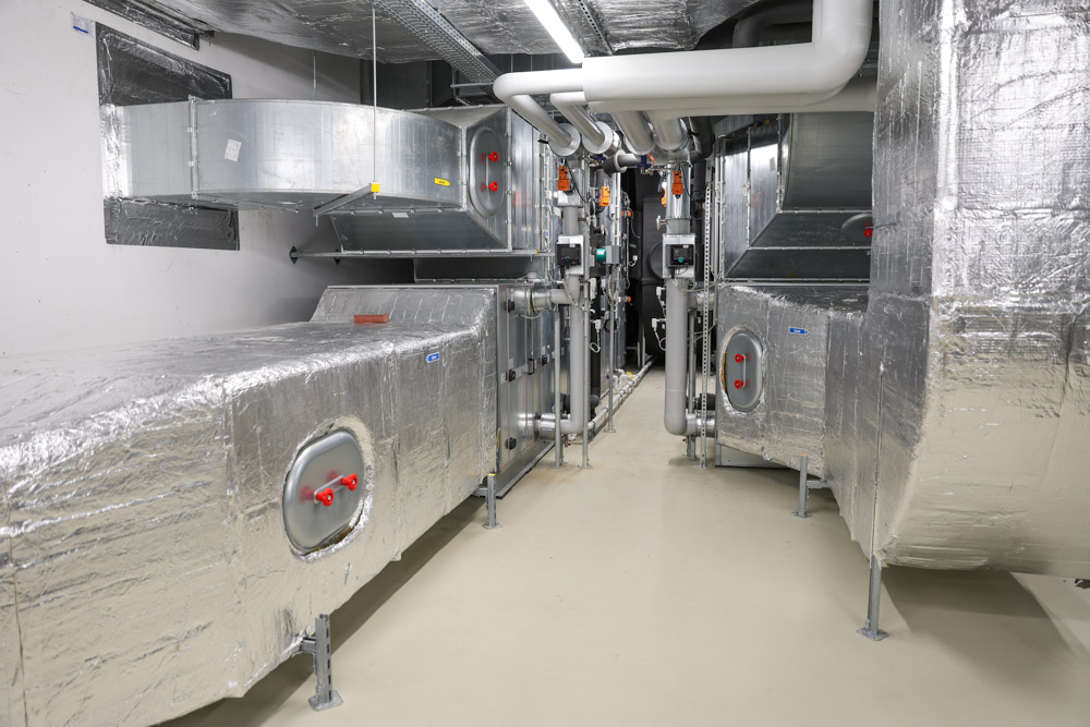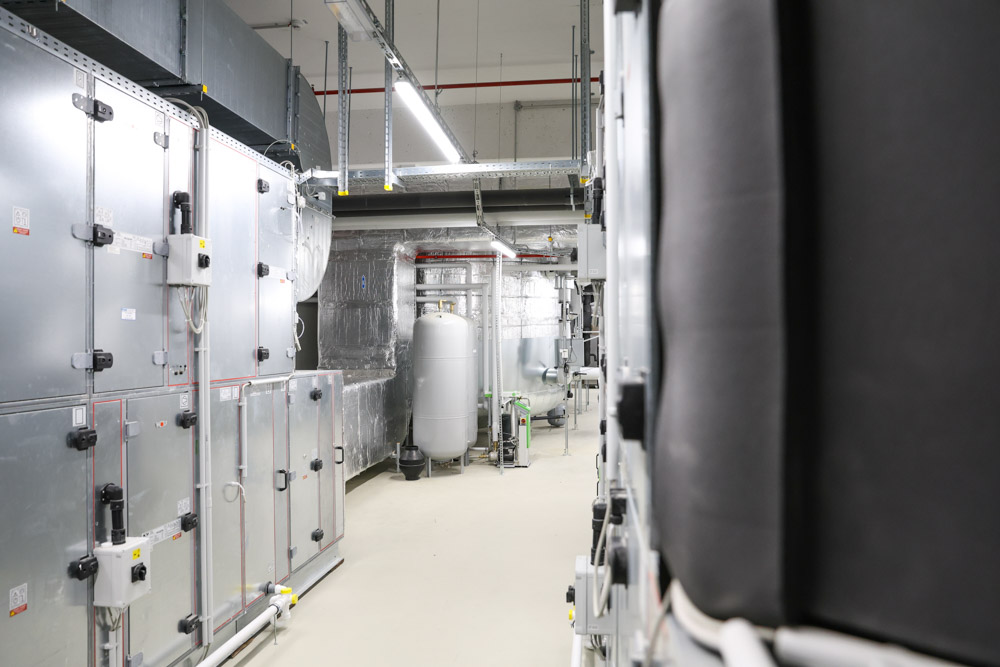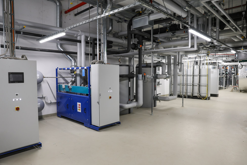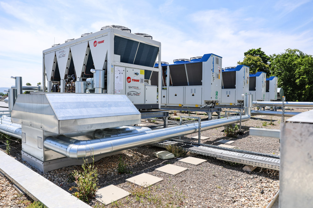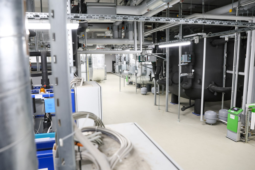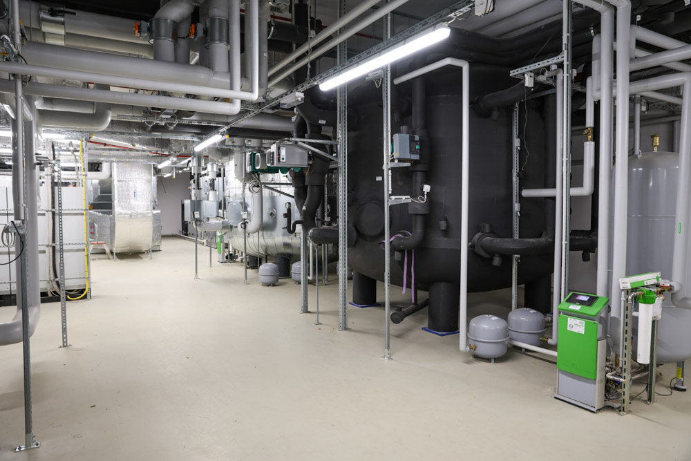 Herzstück des Nachhaltigkeitskonzeptes sind sechs Wärmepumpen – fünf davon mit dem natürlichen Kältemittel Propan – in Kombination mit Betonkerntemperierung und großvolumigen Pufferspeichern. So wird das gesamte Gebäude im Sommer aktiv gekühlt und im Winter CO,-arm beheizt.